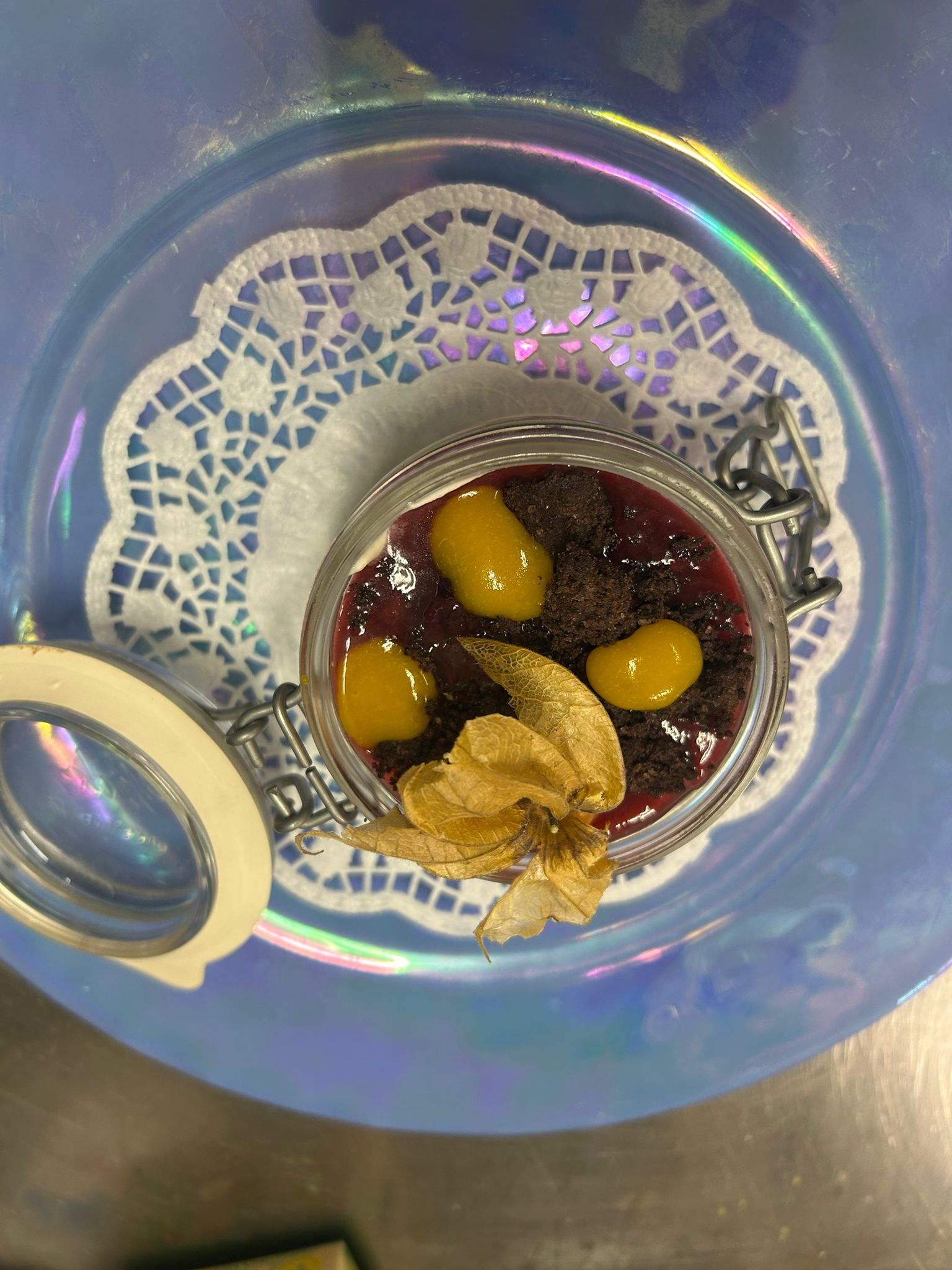 Mascarpone-Creme mit weißer Schokolade und Himbeersauce